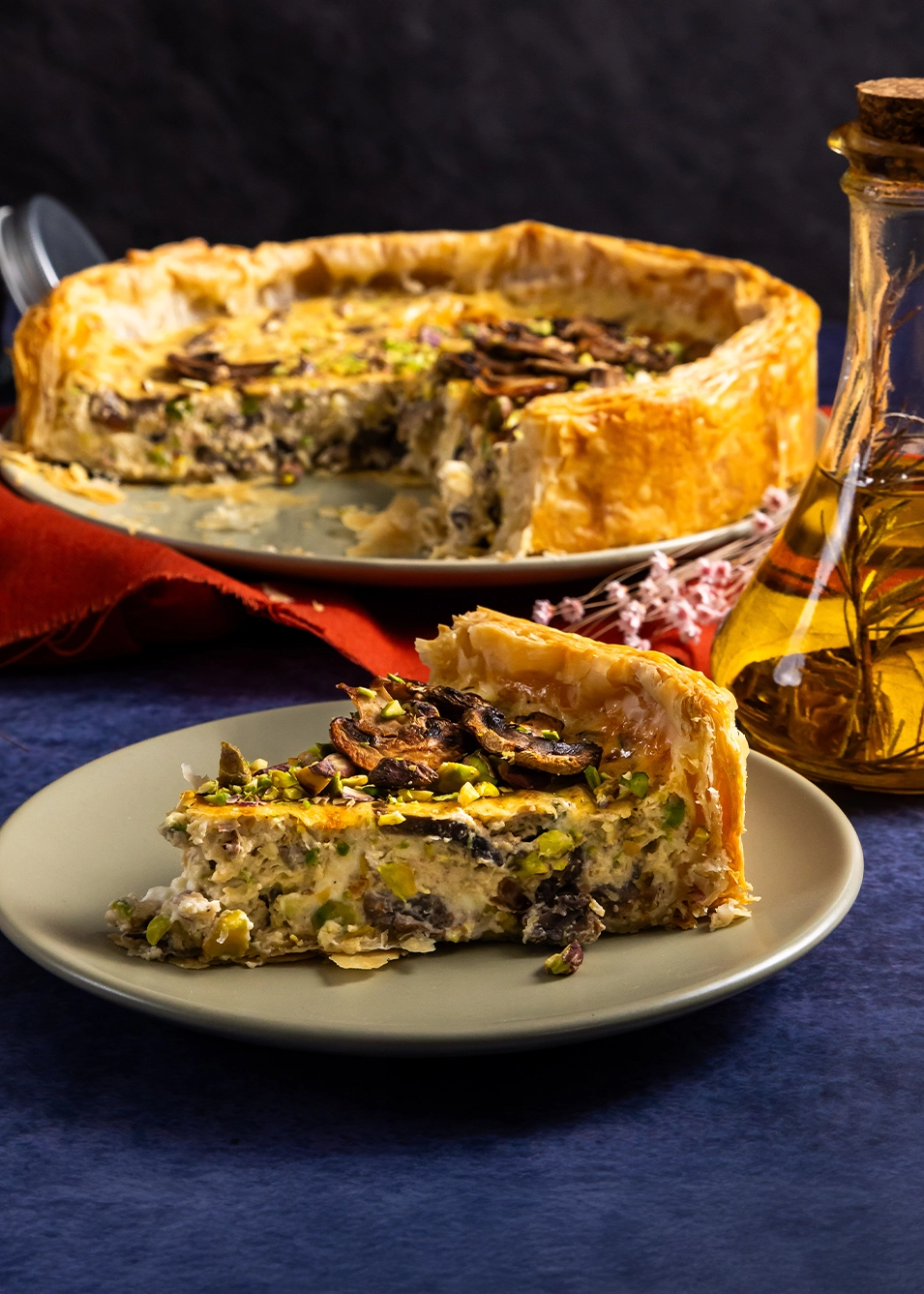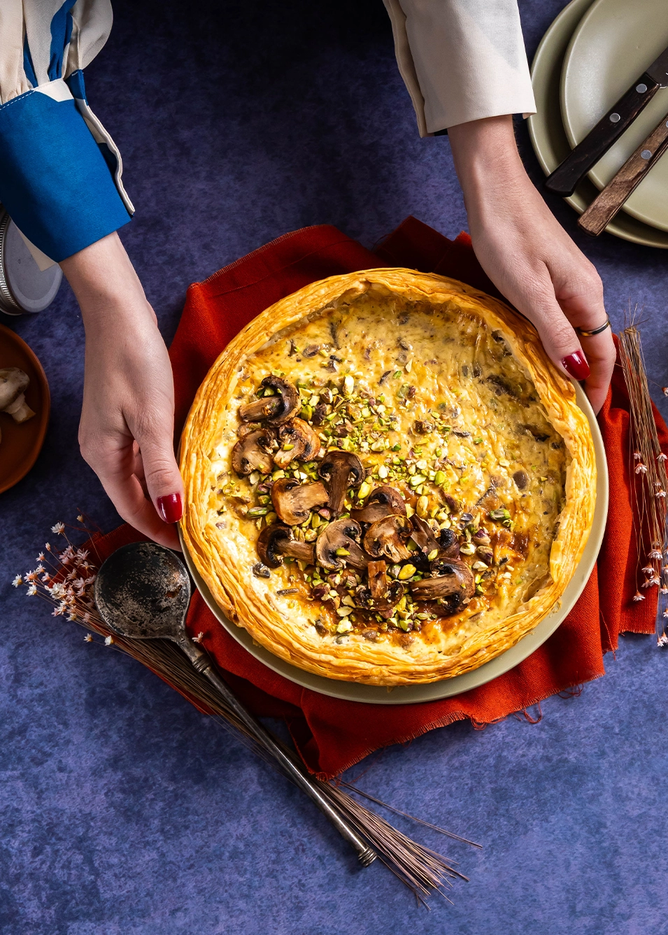 7. Misturar o cream cheese, os ovos, o creme de leite, o queijo parmesão, os cogumelos e os pistaches (guardar um pouco de cogumelo e de pistache para decorar);