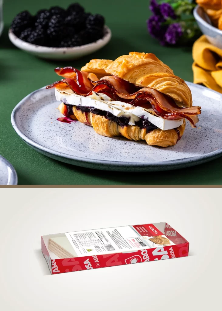 Sanduíche de croissant com queijo brie, bacon e compota de mirtilo